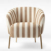 The RedOAK® ASTRA is a contemporary lounge chair featuring a distinctive, eye-catching upholstery pattern. The armchair boasts a curved, barrel-like silhouette, providing a welcoming and comfortable form with its rounded back and arms that flow seamlessly into one another. It is upholstered in a textured fabric featuring bold, vertical stripes of alternating off-white and warm tan color stripes, lending it a stylish, mid-century modern aesthetic. The chair is supported by four slender, slightly splayed metal legs with a brushed brass or gold finish, offering a delicate contrast to the chair's substantial body. Set against a clean white background, this piece of furniture is presented as a sophisticated accent for any modern living space. Its design balances comfort, pattern, and elegance.