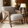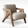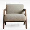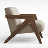 The RedOAK® MUSE is an elegant and modern lounge chair featuring a distinctive mid-century modern aesthetic. The chair boasts a substantial, yet clean, frame, with a warm, natural finish. Its most striking design element is the geometric, open-sided armrests structure, giving it a light, architectural feel. The seat and back cushions are generously padded for comfort and upholstered in a textured, light-neutral fabric light beige color, offering a pleasing contrast legs. This piece is designed to be a comfortable yet visually striking accent in a living room, study, or sophisticated office space.