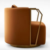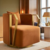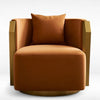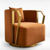 The RedOAK® OMBRA is a striking modern armchair, featuring a deep burnt tan upholstery that contrasts sharply with its bold, geometric brushed gold-tone frame. The chair has a substantial, squared body with a plush, rounded seat base, and a matching accent pillow is included for comfort. The most distinctive design element is the open, angular metal framework that serves as the chair's arms, giving it a distinctive Art Deco or contemporary flair. It appears to be a swivel chair, resting on a smooth, circular gold-tone pedestal base, making it a functional as well as stylish statement piece suitable for a luxurious living space.