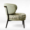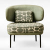 The RedOAK® REGAL is a low-profile, mid-century modern-inspired lounge chair with an open-back design defined by its contrasting fabrics. The main seat cushion features a striking, large-scale geometric pattern in olive and cream, offering a bold visual statement. The attached round backrest and partial armrests are upholstered in a solid, lighter sage bouclé or textured fabric, creating depth and softness. The chair structure is supported by a dark, slender metal frame and tapered dark legs, keeping the profile light. A small matching geometric throw pillow provides an extra layer of comfort and cohesive stylistic detail, completing this artistic accent piece.