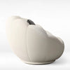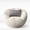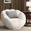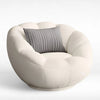 The RedOAK® SNUG is a contemporary accent chair designed for maximum comfort and style. Its silhouette is round and enveloping, creating a cocoon-like feel, often associated with a shell or flower petal design. The chair is completely upholstered in a plush, textured fabric, Off-white material, which emphasizes its soft, cloud-like aesthetic. The back and sides feature gentle, stitched channelling give it a pillowy, sculpted look and enhance the seating experience. The chair appears to rest on a recessed or hidden base, often incorporating a swivel mechanism, making it a functional and visually light addition to a modern or cozy interior space. It is accessorized with a grey cushion featuring vertical white pinstripes.