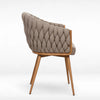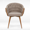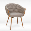 The RedOAK® ROUL is a café chair that presents a blend of modern design and comfortable texture. The seat and backrest are generously cushioned and upholstered in a neutral fabric. The key visual feature is the heavily textured, enveloping backrest which consists of thick rolls of fabric woven and stitched together to create a complex, cushioned pattern resembling ropes or braids. This design provides both a unique aesthetic and a sense of cosiness. The chair is supported by slender, angled metal legs in a light natural finish, contributing to its modern, airy look. The armrests are partially defined by exposed wooden supports that frame the sides of the textured back. The overall design suggests a comfortable and stylish piece suitable for dining, café, or casual lounge settings.