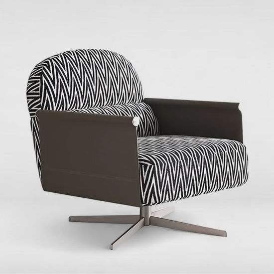 Experience luxury and comfort with the RedOAK® SERENO. This beautiful swivel lounge chair boasts a sturdy metal leg and dual toned upholstery in a monochrome zigzag pattern fabric. Enjoy a stylish addition to your space while lounging in ultimate comfort.