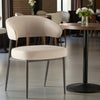 Introducing the RedOAK® DUNE, a contemporary café chair that blends elegance with comfort, making it an ideal choice for both dining and lounge settings. Its gentle, rounded backrest and armrests offer ergonomic support, wrapping around the sitter for a sense of enclosure and relaxation. The plush, upholstered seat is finished in a soft ivory tone, providing a neutral yet sophisticated appeal that suits a variety of modern interiors. Sleek, tapered legs in a contrasting dark finish add a refined touch and ensure durability. The minimalist design emphasizes clean lines and subtle curves, exuding understated luxury. Crafted from high-quality materials, this chair promises resilience and longevity in high-traffic environments. Perfect for cafés, restaurants, or upscale home dining rooms, it seamlessly combines style and functionality.