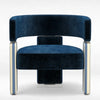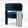 Experience comfort and style with the RedOAK® SWAY, a bold and artistic seating piece that fuses modern luxury with architectural flair. Upholstered in a rich navy blue velvet, the chair features a curved open-back design that offers both comfort and a sculptural silhouette. Its standout detail lies in the legs accented with beige and blue vertical strips, creating a striking rhythm of form and finish. The minimal yet dramatic design makes this chair a true statement piece, suitable for premium interiors where style and individuality are essential.