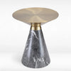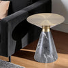 Elevate your decor with RedOAK® JOVIE. This side table stands out with its luxurious and sculptural design, combining bold materials with refined craftsmanship. It features a radiant brushed-gold metal top that exudes elegance, paired with a striking conical base in deep grey tones with natural white veining. The fusion of metallic sheen and rich stone texture creates a sophisticated contrast, making it a centerpiece in any room. Both functional and decorative, this table is perfect for holding drinks, books, or décor items while elevating the overall style of your living space.