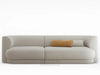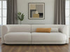 Featuring RedOAK® CHARM sofa is a sleek, contemporary "cloud" style sofa defined by soft, rounded edges and a low-profile silhouette. It is upholstered in a light beige fabric, featuring continuous, flowing lines where the arms and back wrap around the seating platform. The overall design emphasizes comfort and minimalism, with no exposed legs, giving it a solid, grounded look. It includes two simple accent pillows.