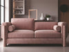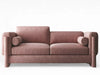 Featuring RedOAK® CRESS is a bold, modern modular-style sofa defined by strong, rectilinear forms and a unique asymmetrical backrest. It is upholstered in a textured dusty rose pink fabric. The arms are substantial and fully upholstered, almost like columns, giving it a weighty, grounded look. The back is visually split, with one cushion taller than the other, and it includes matching round bolster cushions, emphasizing its striking, contemporary profile.