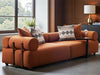 Featuring RedOAK® ECLIPSE is a contemporary modular sofa featuring a rich burnt orange fabric, offering a textured and cozy feel. It has a distinctive design with rounded, bolster-style arms and backrests, creating a soft, voluminous look. The sofa is accessorized with coordinating solid-color and patterned throw pillows. Its low-profile, segmented design makes it a versatile statement piece for a modern or eclectic living space.