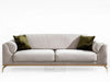 Featuring RedOAK® FERN is an elegant, luxurious sofa with a modern aesthetic, upholstered in a off-white fabric. It features striking vertical channel tufting on the backrest and rolled arms, contrasting with the smooth, deep seat cushions. The sofa is elevated by a sophisticated polished gold-tone frame and tapered legs, giving it a glamorous, high-end appeal. Paired with two plush, dark olive green cushions, it is designed to be a centerpiece in a refined, contemporary setting.