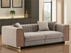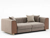 Featuring RedOAK® JAMES is sophisticated sofa combines plush comfort with luxurious textures, upholstered in a muted taupe fabric. It features striking vertical channel tufting on the backrest and the exterior side panels. The design is elevated by contrasting faux leather panels on the inner arms, adding a bold, exotic touch. Resting on base with subtle gold-tone accents at the front corners, this piece is a glamorous and structured addition to a high-end living space.