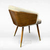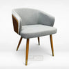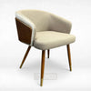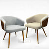 Introducing the RedOAK® KRONO, contemporary dining chairs with a distinctive design combining fabric upholstery and wood accents. They feature a curved, barrel-style backrest for comfortable seating. The chairs are supported by tapered legs that end in elegant gold-tone ferrules. One chair is upholstered in light grey fabric, and the other in light beige, both incorporating a striking dark-wood panel on the exterior back piping, highlighting a modern aesthetic.