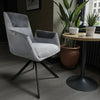 Featuring the RedOAK® LUNEX, a contemporary seating piece designed for both comfort and style. Upholstered in a soft, textured grey fabric, it features a high backrest and gently sloped armrests, offering ergonomic support for extended use. The chair's upholstery includes darker grey accent panels on the armrests and headrest area, adding visual contrast and sophistication. Its modern silhouette is complemented by a sturdy, black powder-coated metal base with four splayed legs, ensuring stability and durability. The slightly curved seat and back provide a snug fit, enhancing relaxation. Ideal for café settings or modern dining spaces, the LUNEX café chair seamlessly blends function with aesthetic appeal.