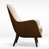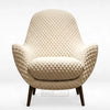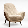 The RedOAK® WILLOW is a distinctly modern and sculptural lounge chair with a striking visual balance between its warm frame and the soft, quilted upholstery. The chair features a deeply curved and contoured shell, forms the back and armrests in a single, elegant sweep. The interior of this shell is fitted with a plush, cushion-style upholstery that is segmented with vertical channel tufting or quilting, enhancing the chair's luxurious and comfortable look. The entire piece is supported by slender, angled legs, reinforcing its mid-century modern influence. It serves as a statement piece, blending an architectural silhouette with soft, inviting textures.